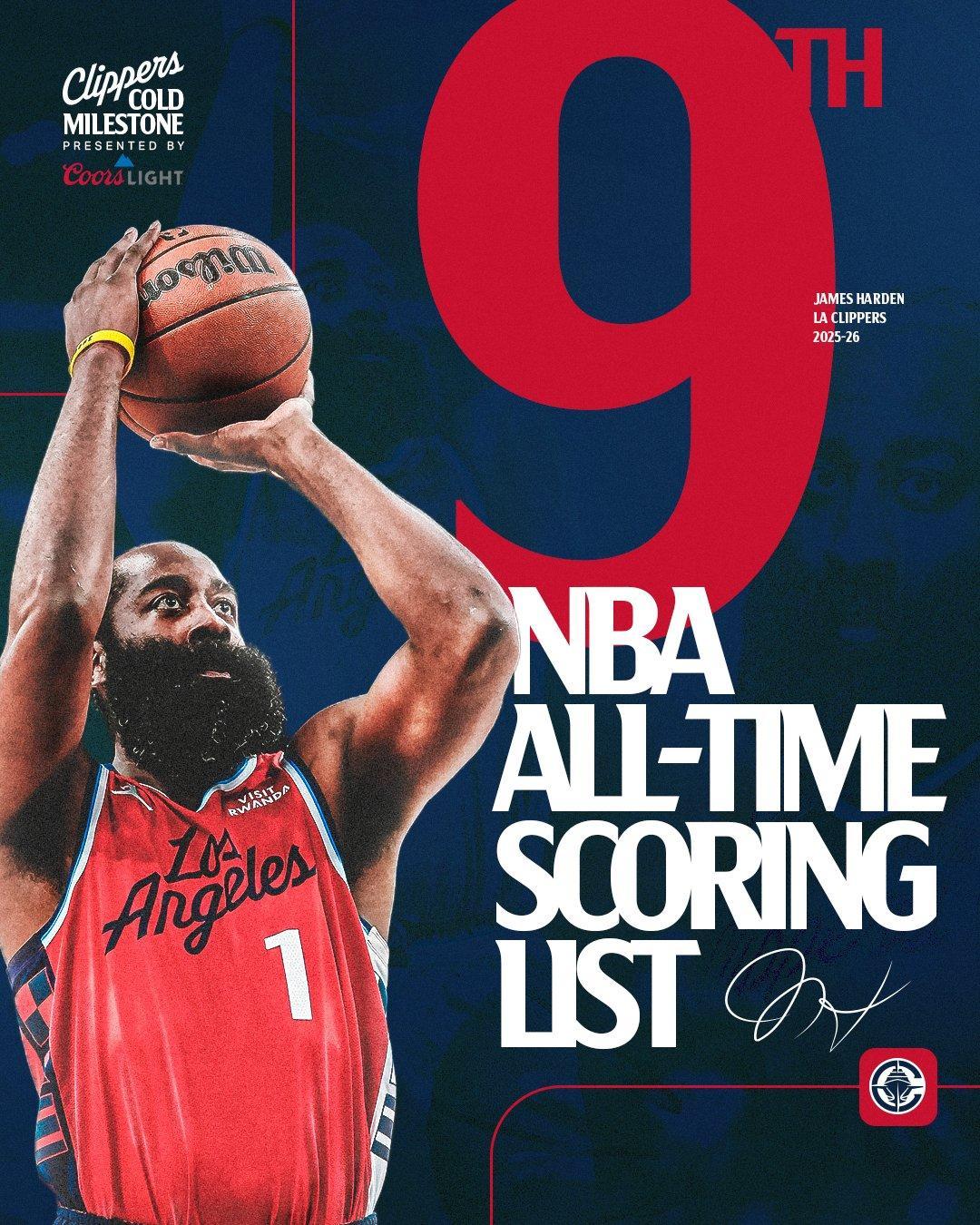 哈登生涯得分升至NBA历史第9